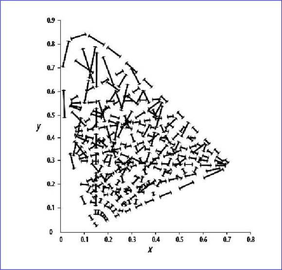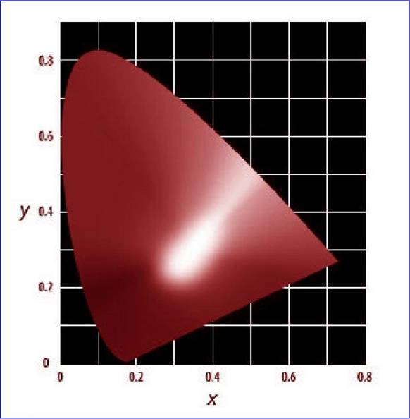 Их, не мудрствуя лукаво, назвали X, Y и Z и решили принять их за основу измерения цвета, а чтобы немного удобнее ориентироваться в получаемом цвете разработали модель xyY — где Y есть уже параметр яркости, а х и у получаются из X, Y и Z: x=X/(X+Y+Z), y=Y/(X+Y+Z). Иногда вводят и z=Z/(X+Y+Z), но, очевидно, z=l-x-y. В координатах ху обычно отображают локус набор всех цветов, воспринимаемых глазом.