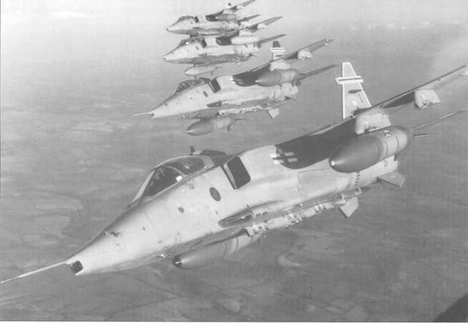 Слухи о снятии «Ягуаров» с вооружения RAF ходили постоянно, но самолет был лучшим в ВВС с точки зрения критерия «стоимость – эффективность». В полете – «Ягуары» из четырех британских эскадрилий авиакрыла из Колтисхэлла. На переднем плане – самолет 6-й эскадрильи с подвешенной под фюзеляжем КА Б «Пэйвуэй II», дальше – «Ягуар» из 41-й эскадрильи с разведывательным контейнером ЕО GP1 на подфюзеляжном пилоне; за ним – самолет из 54-й эскадрильи с контейнером TIALD. Последний в строю – «чистый», без внешних подвесок, самолет из тренировочной 16-й эскадрильи.