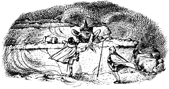 Часов в десять первые хлопья снега упали Джил на руку. Через несколько минут они уже падали густо. Через четверть часа земля заметно побелела, а через полчаса начался настоящий снегопад. Снег летел им в глаза, они почти ничего не видели (это надо отметить, чтобы понять всё последующее). Вскоре невысокая гора скрыла от них огни в замке. То и дело протирая глаза, путники видели лишь на несколько шагов вперёд. Нечего и говорить, что им было не до разговоров.
