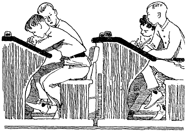 Рядом с ним сидит Муня Блохин, маленький, кучерявый и быстрый. Он тотчас ныряет под парту: расширить телефонную сеть.