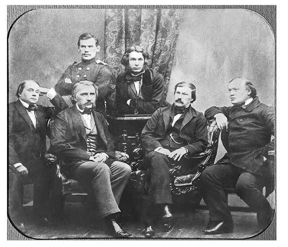 Групповой портрет писателей – членов редколлегии журнала «Современник». Во втором ряду: Лев Толстой и Дмитрий Григорович. Сидят: Иван Гончаров, Иван Тургенев, Александр Дружинин и Александр Островский. 1856 год. Фотография Сергея Левицкого [7]