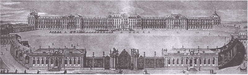 Большой Царскосельский дворец и парадный плац перед ним. Гравюра по рисунку Махаева. Британский музей