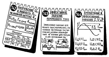 Указывая величину переменного напряжения или тока, обычно имеют в виду их эффективное значение. Как известно, амплитуда — это наибольшее значение переменного напряжения или тока, которое появляется лишь на мгновение. Эффективное же значение говорит о способности переменного тока совершать работу в среднем за весь период (листы 143, 144). Совершенно очевидно, что эффективное значение тока Iэф или напряжения Uэф меньше амплитудного: ведь амплитуда бывает лишь дважды за весь период, а все остальное время ток значительно меньше и моментами даже становится равным нулю. Для переменного тока, протекающего в сети, эффективное напряжение в 1,4 раза меньше амплитуды. Это значит, что при эффективном напряжении 220 в амплитуда достигает 308 в. Напряжение сети, напряжение на обмотках трансформаторов, токи и напряжения на шкале измерительных приборов всегда указываются в эффективных значениях.