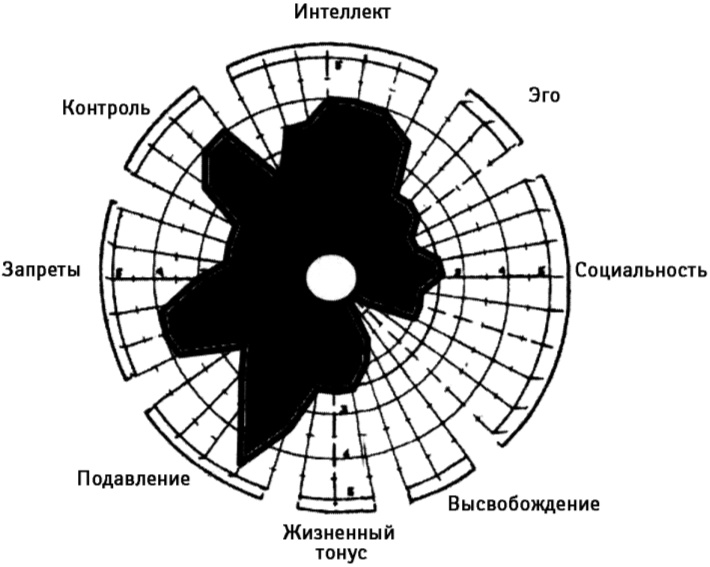 Данная психограмма может быть поделена на четыре части. В верхней представлены сознательные аспекты личности – интеллект, самоконтроль, Эго. В нижней представлена сфера бессознательного – выражение эмоций, жизненный тонус, подавление. Левая часть отражает интровертную сторону личности, охватывающую запреты и контроль; правая же отведена экстравертным характеристикам, Эго и социальной деятельности.