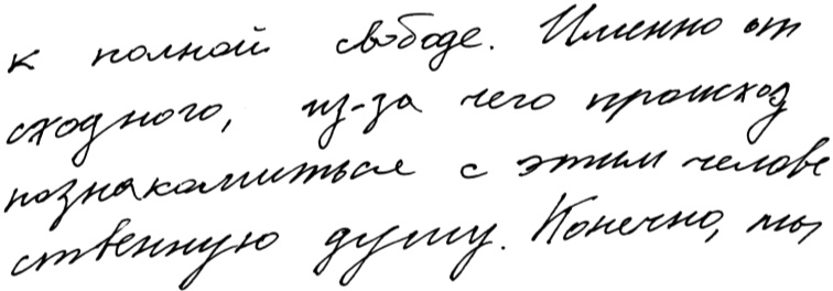 Слишком тесно стоящие слова, соприкасающиеся или почти соприкасающиеся друг с другом (рис. 23), говорят о том, что пишущий испытывает острую потребность в обществе других людей. Он не оставляет места для саморефлексии, и поскольку он не нуждается в собственном пространстве, то не признает и право других людей на таковое. Его рамки социального поведения – то есть того, что он считает социально приемлемым, «приличным» – оказываются весьма расплывчатыми.