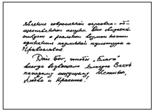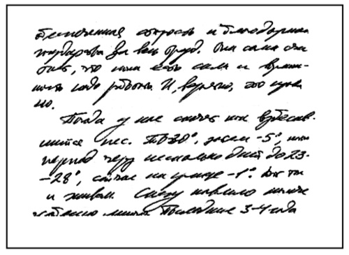Соразмерные (но не обязательно абсолютно ровные) поля окружают написанное со всех сторон, как рама картину (рис. 29). Такие поля открывают в писавшем умение планировать события, четкое чувство времени. Пишущий предпочитает организованность и порядок во всем и не любит каких-либо отклонений, спутывающих его планы. Он не скуп, однако и не расточителен. Все свои ресурсы (физические, материальные, временные) он стремится расходовать с умом.