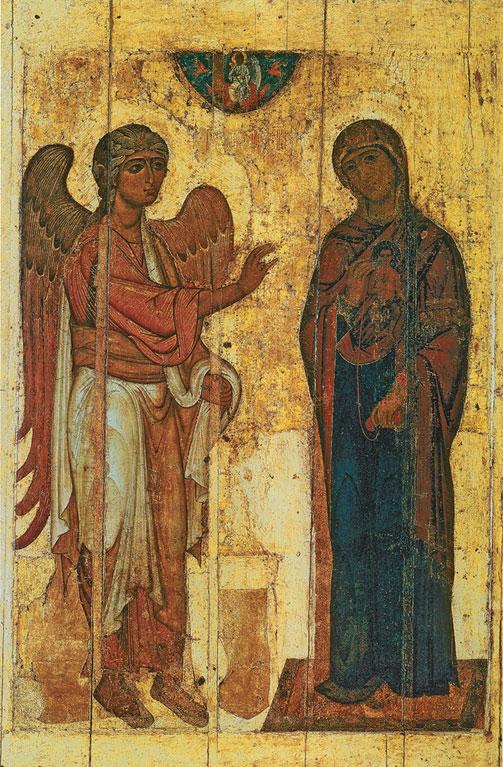 В основе сюжета лежит событие, изложенное в Евангелии от Луки, – архангел явился Деве Марии с благой вестью о том, что у нее родится дитя, которое наречется Сыном Божьим. Мария склонила голову в знак повиновения Божьей воле. В иконе есть редкая иконографическая подробность: в лоне Богоматери представлен воплотившийся Младенец Христос. В верхнем сегменте изображен Христос Ветхий Деньми (Ветхий Днями) – особый иконографический тип, который считается ветхозаветным прообразом Христа. От его руки исходил луч (не сохранился), проникающий в лоно Богородицы.