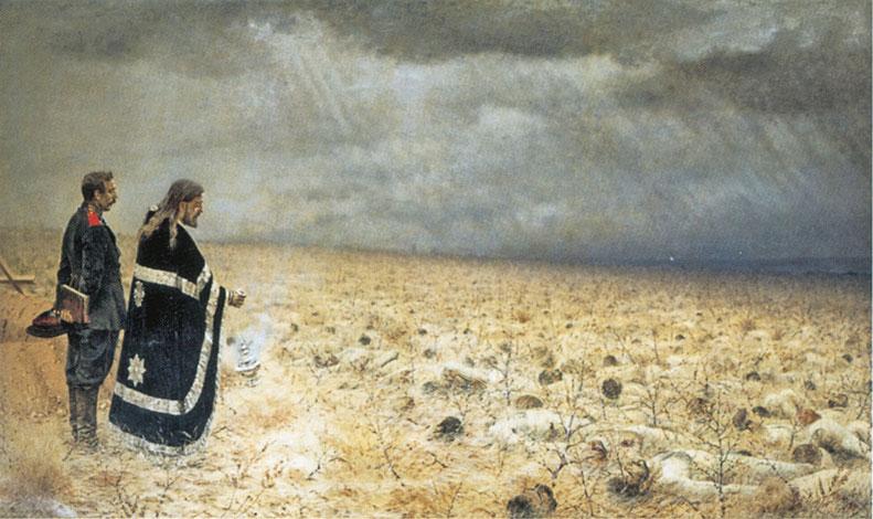 На самой пронзительной картине Балканской серии Верещагин изобразил сцену, увиденную им в полях около укреплений болгарского местечка Телиш. Там погибли передовые части русской армии, трупы были осквернены турками. Художник присутствовал при обряде отпевания на этой страшной панихиде. Картина построена на выразительном «взаимопроникновении» бесконечного пространства земли, устланной трупами, и неба, печаль которого нисходит на землю косым серым дождем. По свидетельству дочери Третьякова, В. Зилоти, на выставках Верещагина «не было почти никого из публики, кто бы не вытирал слез… Помню, как-то наш отец сказал: „Верещагин – гениальный штукарь, но и – гениальный человек, переживший весь ужас человеческой бойни“».