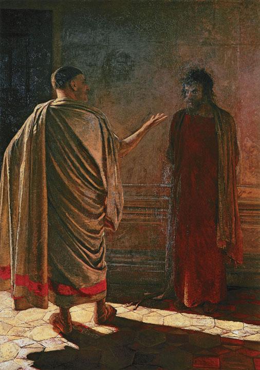 В образах этой знаменитой картины сталкиваются два противоположных начала, два миропонимания. В облике прокуратора Иудеи Понтия Пилата подчеркнуто плотское, земное начало: его мощная фигура рельефно выделена светом. Изможденный, почти бесплотный Христос стоит в тени. Он ничего не отвечает на вопрос Пилата, потому что истина – это он сам, и эта Истина сокрыта от Пилата. В отличие от П. Третьякова, которому картина не понравилась, Л. Толстой был от нее в восторге и настоятельно просил Третьякова приобрести это полотно. «Окончательно решить может только время, но ваше мнение так велико и значительно, что я должен поправить ошибку, теперь же приобрести картину и держать ее до времени, когда можно будет выставить», – согласился Третьяков.