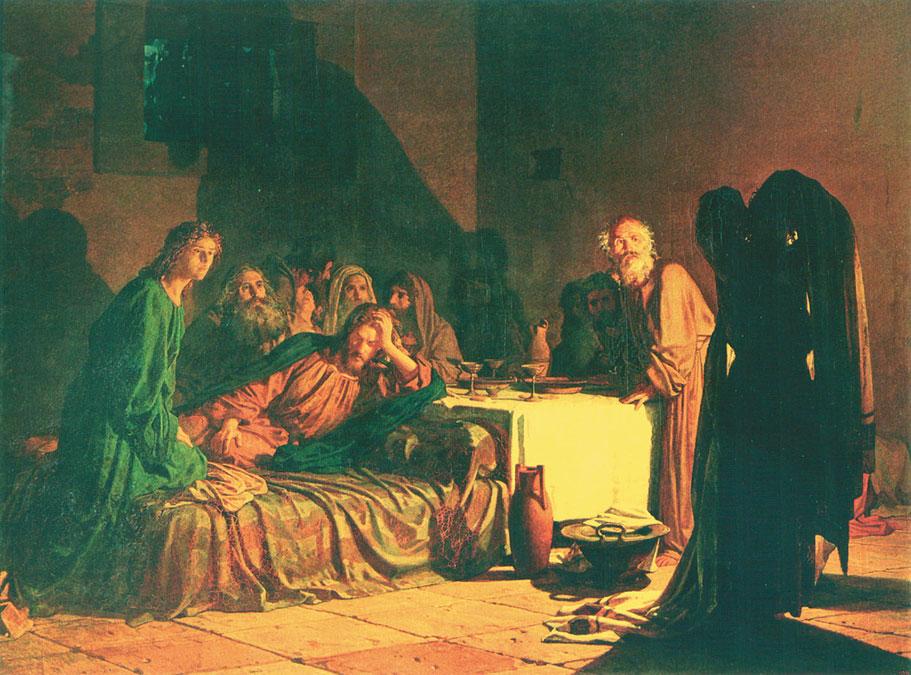 Художник переосмыслил евангельский сюжет в историческом и нравственном плане. Перед нами предстает сцена трапезы Христа и его учеников. После слов Иисуса «один из вас предаст Меня» предатель Иуда уже обнаружил себя – представ перед своими товарищами темной мрачной тенью, он покидает трапезу. Трактовка Ге отличается от традиционного воплощения этого сюжета, где Иуда остается неузнанным. Момент узнавания предателя приводит к острой психологической драме: на лице Христа – благородная скорбь, Петр возмущен изменой (в его облике художник изобразил самого себя), остальные апостолы в немом изумлении смотрят на удаляющегося Иуду. Своей реалистической подачей «Тайной вечери» Ге удивил современников, картина имела большой успех.