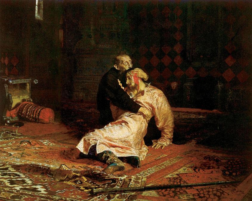 В центре композиции из синевато-холодного тревожного полумрака вспышкой света выхвачены две фигуры. Сцену убийства можно легко вообразить во временном развитии. Вначале была вспышка царского гнева: опрокинулось кресло, брошен посох. Густая лужа крови справа на ковре указывает то место, куда упал царевич от сильного удара в висок. Царь, обезумевший от ужаса, пытается остановить кровь, прижав ладонь к виску сына, в раскаянье просит у него прощения, целует в голову. Мы видим итог трагедии: угасающий взгляд царевича, его беспомощное тело, медленно сползающее на пол. «И как написано, боже, как написано! В самом деле, вообразите, крови тьма, а Вы о ней не думаете, и она на Вас не действует, потому что в картине есть страшное, шумно выраженное отцовское горе, и его громкий крик, а в руках у него сын, сын, которого он убил, а он… вот уж не может повелевать зрачком, тяжело дышит, чувствуя горе отца, его ужас, крик и плач, он, как ребенок, хочет ему улыбнуться…» – восхищался И. Крамской.