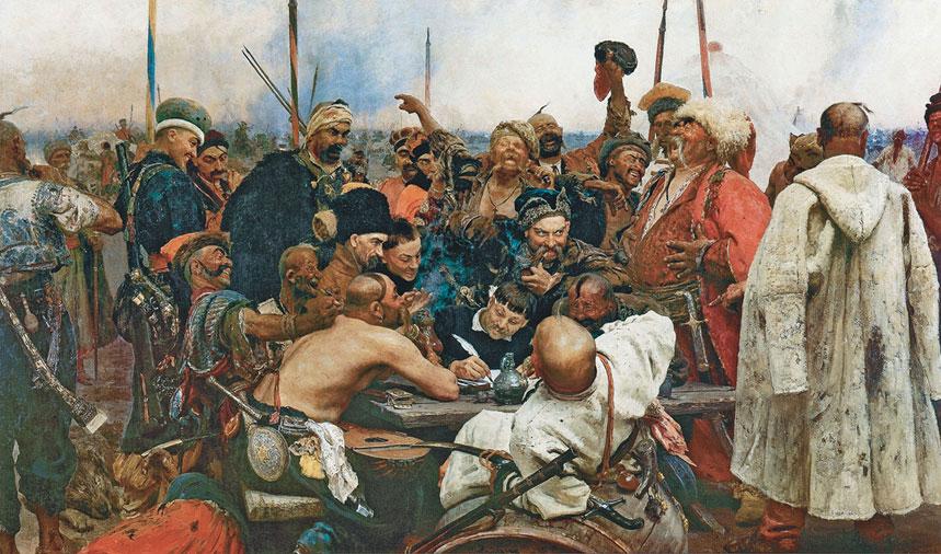 Работе предшествовал многолетний труд по сбору исторического материала о донских казаках. Текст послания казаков турецкому султану Ахмету III от 1676 года, которое читал Репин, анекдотический – подлинное письмо было другим. Смысл послания примерно следующий: «убирайтесь от нас, иначе будем лупить вас». Сюжет картины вобрал в себя и анекдот, и исторические предания, и литературные ассоциации с повестью «Тарас Бульба» Н. Гоголя. Рядом с писарем изображен легендарный атаман запорожцев Серко, хохочущий казак в белой бурке справа – Тарас Бульба. Эту картину называют «энциклопедией смеха» – настолько многообразны смеющиеся лица казаков.