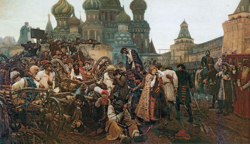 В 1698 году стрельцы, подстрекаемые царевной Софьей, подняли мятеж против молодого царя Петра I. После подавления бунта казни мятежников проходили по всей Москве. На картине Сурикова перед нами сердце России – Красная площадь. С разных концов города сюда привезли осужденных. С ними пришли проститься их родственники, которые образуют живописную толпу, напряженно ожидающую начала казни. Справа на коне восседает Петр, наблюдая за происходящим. В многолюдной толпе стрельцы выделяются белыми рубахами и свечами в руках. Горящие и гаснущие свечи в картине, по меткому наблюдению М. Волошина, становятся метафорой продолжающейся или угасающей жизни. Одного из осужденных уже ведут в сторону виселиц, и его потушенная свеча брошена на землю. В центре картины возвышается фигура стрельца, прощающегося с народом, он прижимает свечу к груди, но к ней уже тянется рука солдата-преображенца…