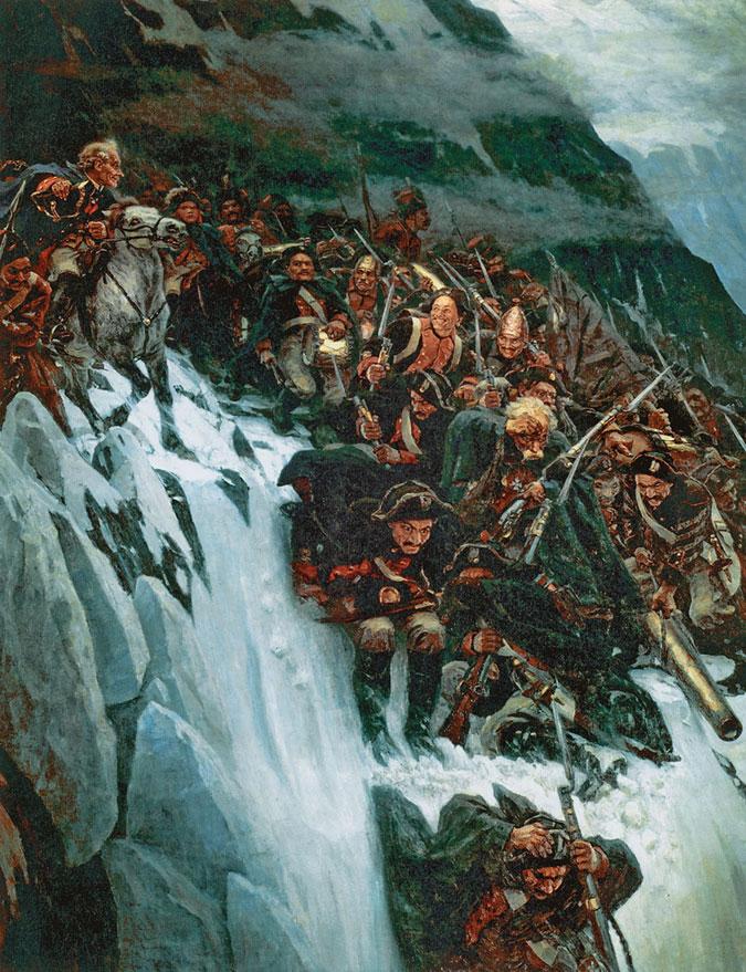 В 1799 году русские войска в составе 2-й антифранцузской коалиции (Австрия, Англия, Россия, Турция) под командованием Александра Васильевича Суворова (1729/1730–1800) совершили героический переход через Альпийские горы и освободили от французов Северную Италию. Картина была закончена к столетнему юбилею этого знаменательного события. Верный принципу точной исторической правды, Суриков писал этюды на месте изображенных событий, в Швейцарии. В беседе с художником Я. Минченковым он передал свое впечатление от путешествия в Альпах: «Вылетаешь… как будто в небо, в свет, на мост, а сбоку и внизу – облака над бездной!».