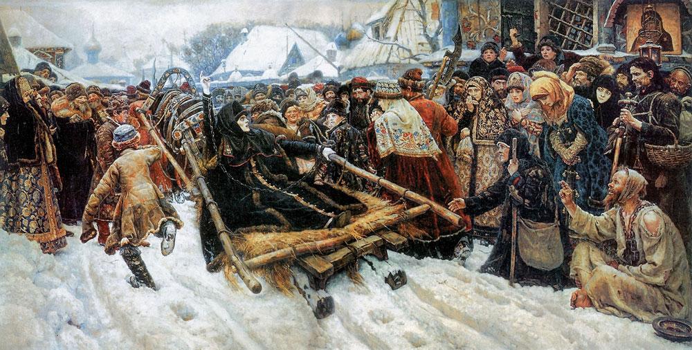 Феодосия Прокофьевна Морозова (1632–1675) была одной из героинь церковного раскола. Пестрая толпа теснится вокруг саней, чтобы взглянуть на осужденную. Справа рядом с санями идет родная сестра Морозовой, княгиня Евдокия Урусова, старообрядка, разделившая крестный путь своей сестры. Проезжая мимо храма, Морозова высоко вознесла над толпой руку с двуперстием – символом старой веры. Единственный, кто не боится открыто поддерживать двуперстием боярыню, – сидящий на снегу юродивый. Он не опасается за свою жизнь: юродивых почитали на Руси как святых и прорицателей. По композиционному и колористическому совершенству, умению передать сложную духовную атмосферу эпохи эта картина стала вершиной в творчестве Сурикова, непревзойденным шедевром русской исторической живописи.