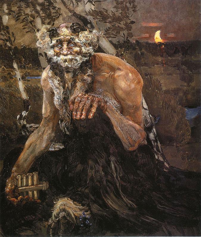 Герой античных мифов, козлоногий бог лесов и полей Пан влюбился в прекрасную нимфу и бросился за ней в погоню, но она, не желая ему достаться, превратилась в тростник. Из этого тростника Пан смастерил свирель, с которой никогда не расставался, наигрывая на ней нежную, грустную мелодию. На картине Врубеля Пан совсем не страшен – он напоминает русского лукавого лешего. Воплощение духа природы, он сам словно создан из природного материала. Его седые волосы напоминают белесый мох, поросшие длинной шерстью козлиные ноги подобны старому пню, а холодная голубизна лукавых глаз словно напитана прохладной водой лесного ручья.