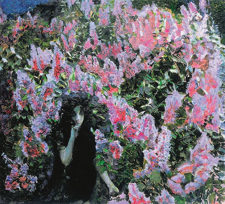 Этот мотив Врубель также нашел на хуторе Плиски. Образ пышного куста сирени рождался из натурных наблюдений, но на картине он преображается в таинственное лиловое море, которое трепещет, переливается множеством оттенков. Притаившаяся в зарослях печальная девушка выглядит как некое мифологическое существо, фея сирени, которая, появившись в сумерках, через мгновение исчезнет в этих пышных россыпях странных цветов. Вероятно, об этой картине Врубеля написал О. Мандельштам: «Художник нам изобразил глубокий обморок сирени…»