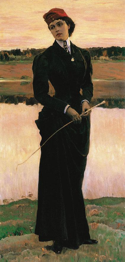 Этот портрет – один из самых пленительных женских образов в русской живописи Серебряного века. Портрет писался в Уфе, в родных местах художника, среди природы, которую он трепетно любил. Дочь художника Ольга в элегантном черном костюме для верховой езды (амазонке) позирует среди вечерней ясной тишины заката, на фоне светлого зеркала реки. Перед нами – прекрасное остановленное мгновение. Нестеров пишет горячо любимую дочь в светлую пору ее жизни – молодой и одухотворенной, такой, какой ему хотелось бы ее запомнить.