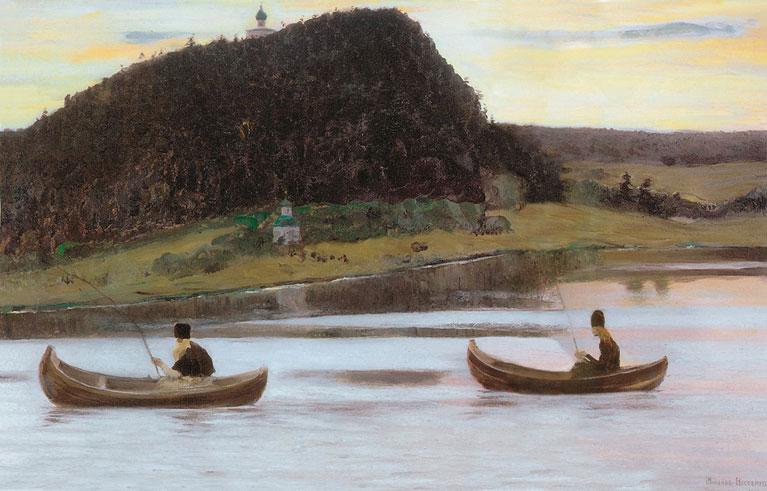 По светлой северной реке среди лесных берегов скользят лодки с монахами. Кругом царит чарующая тишина