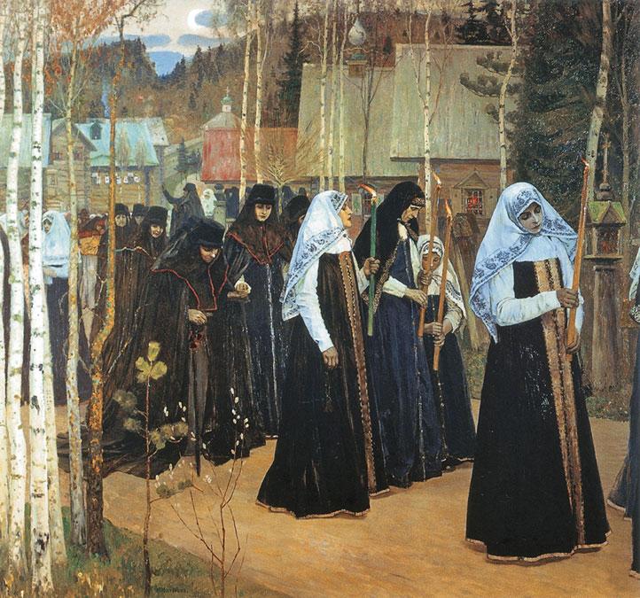 Нежно-одухотворенные молодые женщины в белых платках, решившие посвятить себя Богу, движутся в окружении монахинь в неспешной процессии на лоне прекрасной природы. В руках они держат большие свечи, и сами они уподоблены горящим свечам – их белоснежные платки «вспыхивают» на фоне монашеских ряс белым пламенем. В весеннем пейзаже все дышит божьей благодатью. Мерное движение женщин повторяется в вертикальном ритме тонких молодых березок, в волнистых очертаниях далеких холмов. Нестеров писал об этой картине: «Тема печальная, но возрождающаяся природа, русский север, тихий и деликатный (не бравурный юг), делает картину трогательной, по крайней мере для тех, у кого живет чувство нежное…»