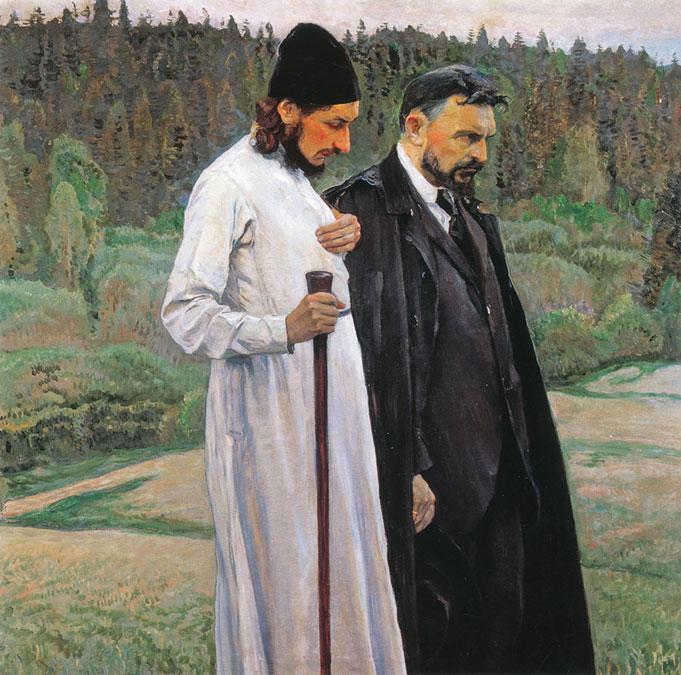 С Павлом Александровичем Флоренским (1882–1937) и Сергеем Николаевичем Булгаковым (1871–1944) – крупнейшими мыслителями, представителями эпохи расцвета русской философии начала ХХ века, Нестеров был связан личной дружбой. Он читал их книги, посещал заседания Религиозно-философского общества им. В. Соловьева, где они выступали, разделял их духовные ориентиры. Этот портрет писался в Абрамцеве накануне революционных перемен в России. Тем настойчивее зазвучала в нем тема раздумья о дальнейшем пути русского народа.