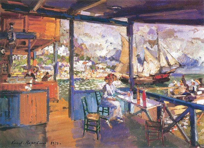 По безмятежному настроению покоя, романтической свежести и красоте колорита эта работа – одна из лучших в творчестве Коровина. Открытой декоративностью, смелостью цветовых сочетаний она близка лучшим пейзажам французских импрессионистов. Мазки художника то гладко стелются, передавая живописные тени на полу прибрежной террасы, то вздымаются в вихре, образуя сгустки облаков… Поразительная живописная свобода здесь превосходно соответствует состоянию «легкого дыхания», которым веет от изображенного мотива.