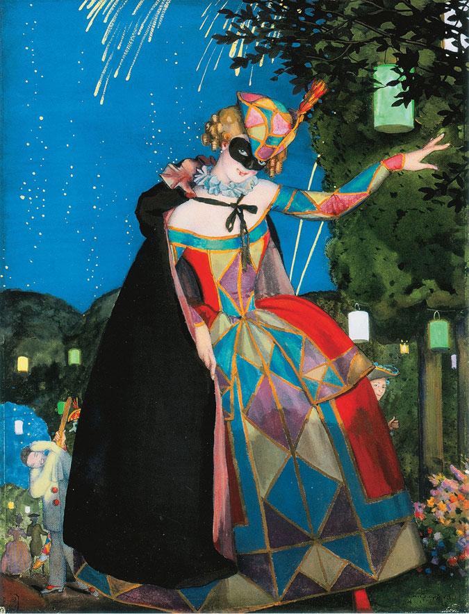 По складу дарования Сомов прежде всего график. Из фигур и элементов фона он слагает изысканный ритмический узор, раскрашивая его в декоративно насыщенные тона яркого южного лета и веселых комедийных масок.