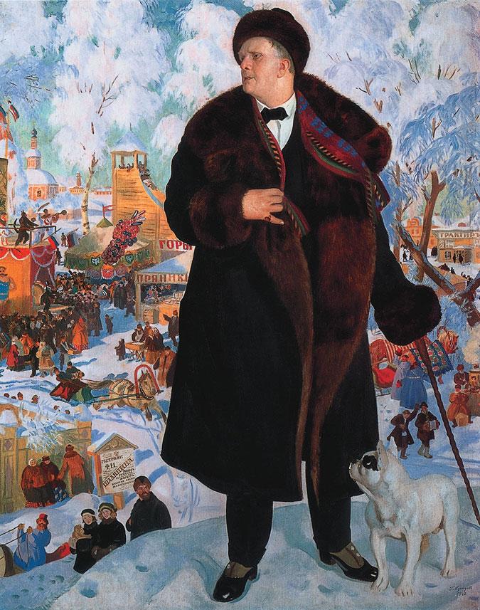 «Много я знал в жизни интересных, талантливых и хороших людей, – вспоминал Шаляпин. – Но если я когда-либо видел в человеке действительно высокий дух, так это в Кустодиеве… Нельзя без волнения думать о величии нравственной силы, которая жила в этом человеке и которую иначе и нельзя назвать, как героической и доблестной». Шаляпин позировал тяжело больному художнику, когда тот был уже прикован к инвалидному креслу. Большой холст приходилось наклонять, чтобы было удобно работать. Художнику удалось передать сам дух творчества Шаляпина – обладателя уникального голоса, великолепного исполнителя народных песен. Шаляпин был плоть от плоти русских просторов, русской широкой души – это подчеркивается выбором пейзажного фона с праздничными народными гуляньями.