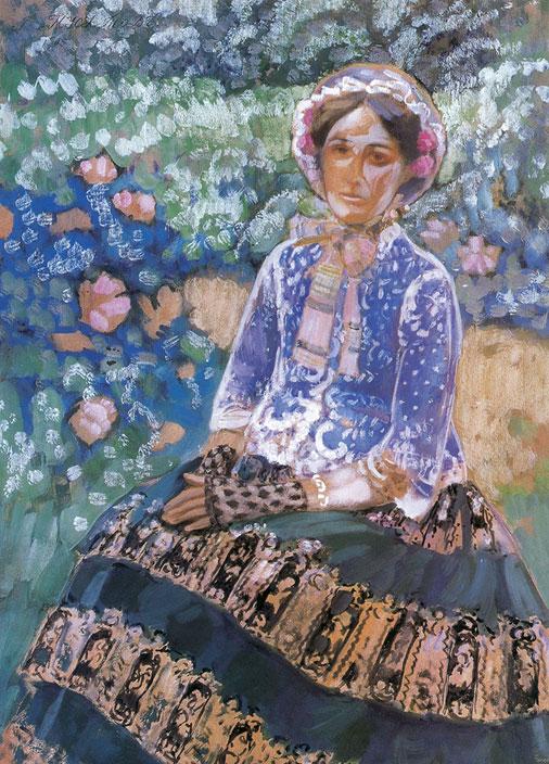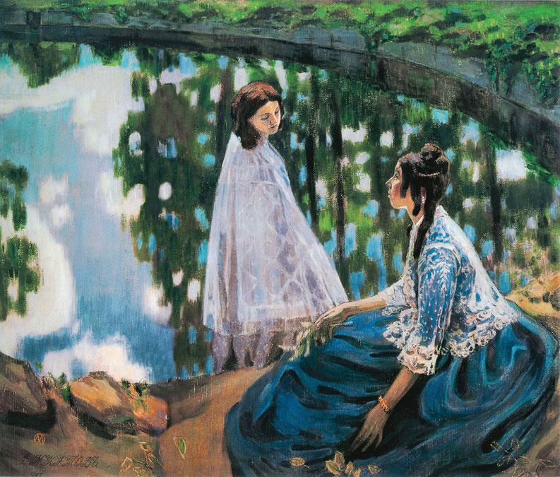 «Водоем» – это тихая элегия, грустная и прекрасная греза о былом. Печальные женщины словно сошли со старинных гобеленов. Одна из них сидит на берегу пруда, и ее юбка «растеклась» складками, подобно кругам на воде. Другая прогуливается вдоль водоема, погруженная в созерцательную тишину, и ее струящаяся шаль тоже вторит водяным струям.