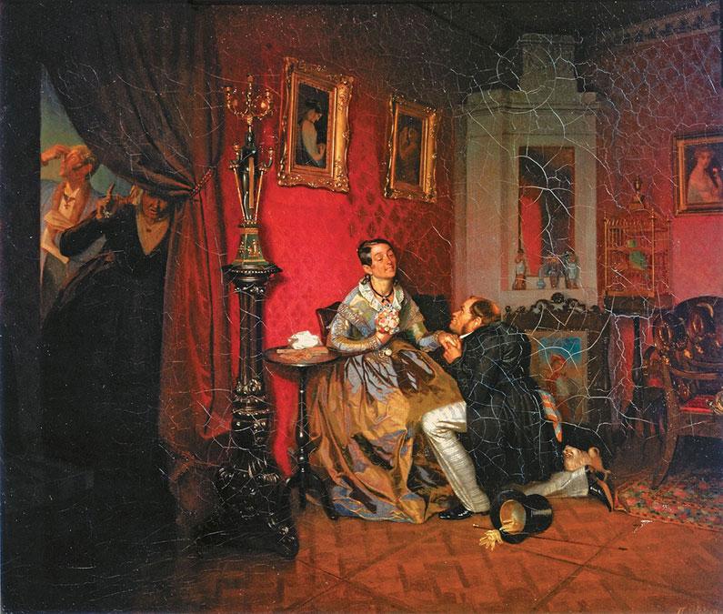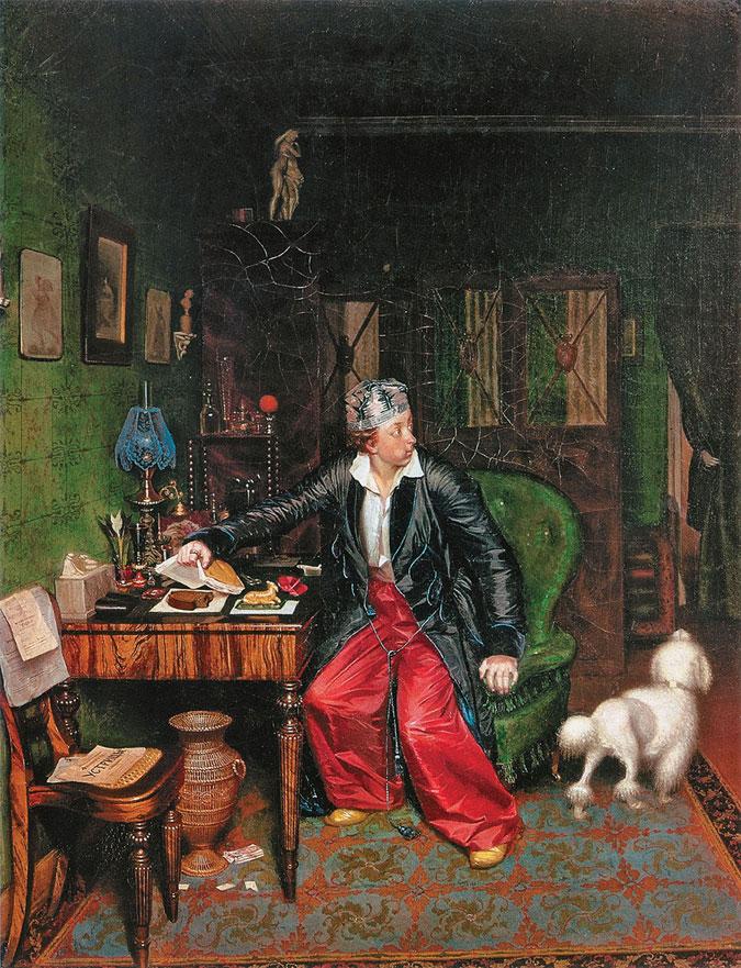 На этой картине (первоначальное авторское название «Не впору гость») разорившийся аристократ, застигнутый врасплох нежданными визитерами, быстро прячет следы своей бедности, прикрывая книгой кусок черного хлеба на столе. Возможно, источником для сюжета послужил фельетон в журнале «Современник» (1848), обличающий франтов, готовых голодать, но жить роскошно напоказ. И правда, кабинет героя полотна наполнен вещами, рассказывающими о его любви к изящному, – под столом большая корзина для бумаг в форме античной