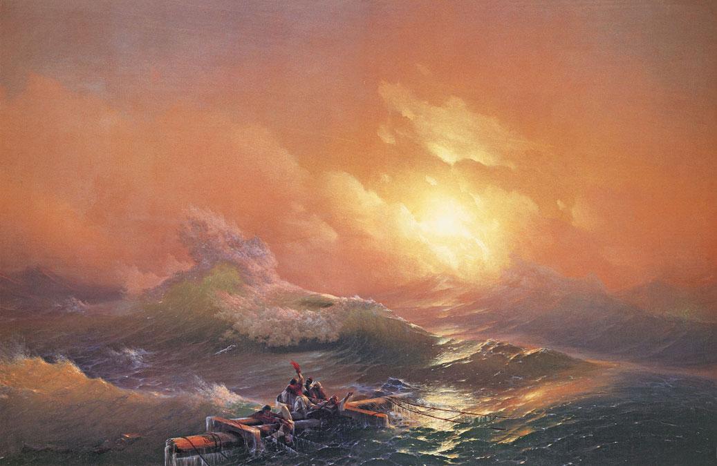 В этой прославленной картине художник создал один из самых ярких и романтических образов бури. Огромные размеры полотна создают эффект присутствия зрителя среди бушующего моря. Линия горизонта выбрана так, что зритель словно качается в волнах, с трудом удерживаясь на обломках мачты вместе с уцелевших после кораблекрушения людьми и вместе с ними готовится принять на себя удар волны девятого вала. Надежду на спасение дарит проглядывающее на горизонте сквозь грозовые облака солнце, осветившее сверкающими бликами разбушевавшееся море. Восход солнца воспринимается здесь как символ преодоления сил хаоса и разрушения.