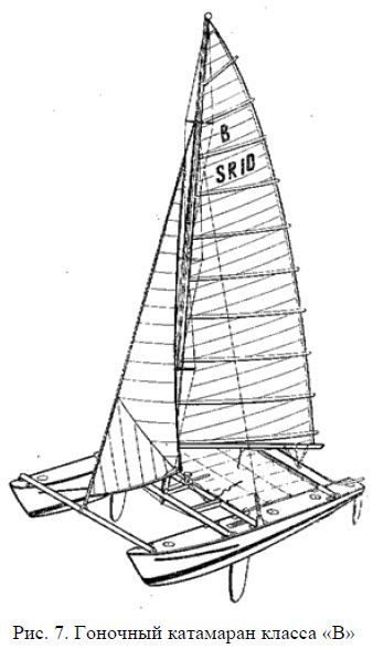 Катамараны (рис. 7) имеют два одинаковых узких длинных корпуса, разнесенных на такое расстояние, чтобы обеспечить большую остойчивость. Сопротивление таких корпусов значительно меньше, чем корпуса обычной яхты, поэтому катамаран развивает значительно большие скорости, чем самые быстроходные гоночные швертботы. Делают и крейсерские катамараны, на которых успешно совершают океанские плавания с весьма высокими средними скоростями (10–15 узлов).
