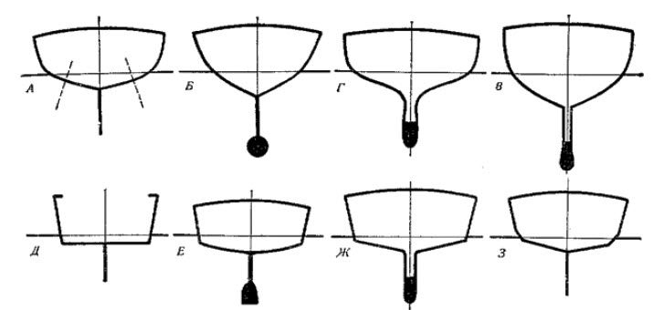 По форме миделя все яхты независимо от типа подразделяют на яхты с округлым миделем, или круглошвангоутные (рис. 9, а, б, в и г), и с угловатым миделем, или шарпи (рис. 9, д, е, ж и з), форма которого составлена из прямых или кривых линий, образующих углы.