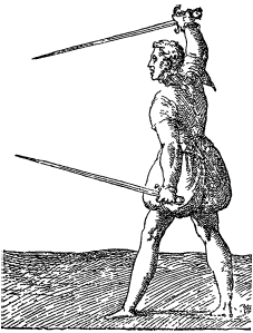 Что бы ни находилось в левой руке – щит, кинжал, плащ или второй меч, – поединок проходил в такой манере, которая весьма напоминает современный кулачный бой; одной рукой дерущийся останавливал атаку противника, а другой наносил контрудары или отклонял атакующее оружие на разных линиях. Оба дерущихся постепенно передвигались вправо или влево, стараясь занять более выгодное положение.
