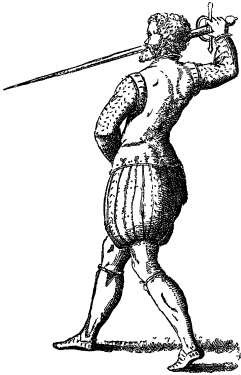 Рис. 36. Terza guardia, alta, offensive, imperfetta; formata dal rovescio ascendente, da cui nasce un mandritta, descendente, o intiero o mezzo. Виджани
