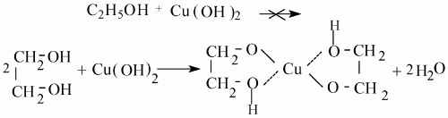 3. Многие спирты обладают и особыми свойствами: многоатомные спирты проявляют более кислые свойства, чем одноатомные и легко образуют алкоголяты не только с металлами, но и с гидроксидами тяжелых металлов. В отличие от одноатомных спиртов, многоатомные спирты реагируют с гидроксидом меди, давая комплексы синего цвета (качественная реакция на многоатомные спирты).