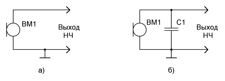 Схемы подключения динамического микрофона не отличаются особой сложностью и в самом простом варианте выглядят так, как показано на рис. 1.1. Параллельно выводам динамического микрофона ВМ1 может быть подключен конденсатор С1 емкостью около 100 пФ, обеспечивающий подавление высокочастотных сигналов (рис. 1.1б).