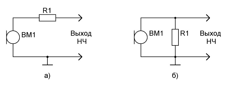 Резистор R1 может включаться последовательно (рис. 1.2а) или параллельно (рис. 1.2б) микрофону ВМ1. Величина сопротивления этого резистора и вариант его включения выбираются в зависимости от параметров примененного динамического микрофона и входных характеристик микрофонного усилителя, и может составлять от десятков ом до десятков килоом. Необходимо отметить, что при параллельном включении резистор R1 препятствует возможному самовозбуждению микрофонного усилителя при отключении микрофона от входного каскада.
