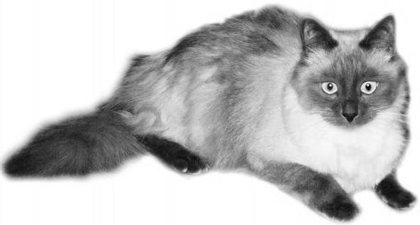 Прежде всего это великолепная, очень красивая, привлекающая к себе все больше внимания и вызывающая неподдельный интерес порода. Сибирские кошки, одевшись в сиамскую шубку, получились очень нарядными. Пушистая сибирская с богатым воротником, с роскошным хвостом кошка как бы на маскараде надела темную «маску» и «перчатки» сиамской кошки. «Маска» на мордочке может быть не только темно-коричневой, но и других интересных расцветок. Часто можно видеть невских маскарадных с полосатой «маской», лапками и хвостом. Унаследовали они полосочки от традиционных тигровых «сибиряков». Изысканно выглядят блю-пойнты с серо-голубыми серебристыми отметинами и светлым телом (рис. 5). Ее представители отличаются крепким здоровьем и высокой продолжительностью жизни.