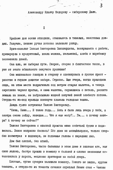 – А где ему быти… В смене… А там, можа, зацепится где… оформит с кем горький стакашек. Не-е… Вы, докторь, не смотрить на мене так… Я к свому Слепушкину без претензиев… Я-то что? Меня уже не отладить… не всподнять… Невылечимая я… Эко шар подкатила под мене судьбина… Не век кричать… Смёртную одёжу уже собрала… Я-то сложу белы ручки на груди… Мне… Мене, барыньку, снесут… А мому б'oле [1] каковски выть? Один-разб'oженный… одним один… Как без мене возростит этих крох?… Что жа я накуделила? Родить родила и помираю… Не по судьбе… Ка-ак ему жити? Без мене он… как в сиротстве остаётся…