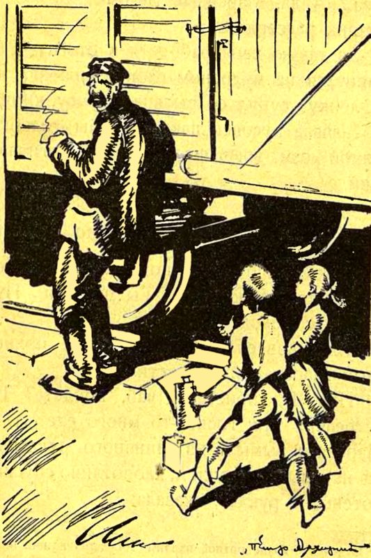 — Пожалуйте в контору, — приглашает агент гражданина в голубых чулках. Вы, горчица, — обратился он к Володьке и Марсиане, — за мной…