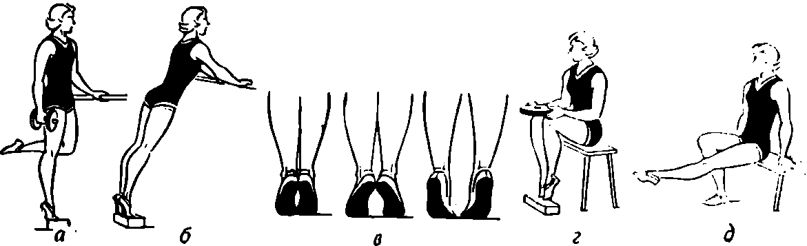 4. И. п. — сидя на скамейке, носки на краю возвышения, на колени положите книгу: поднимайте и опускайте пятки, держа колени вместе (рис. 46, г). Повторите упражнение 12 раз.