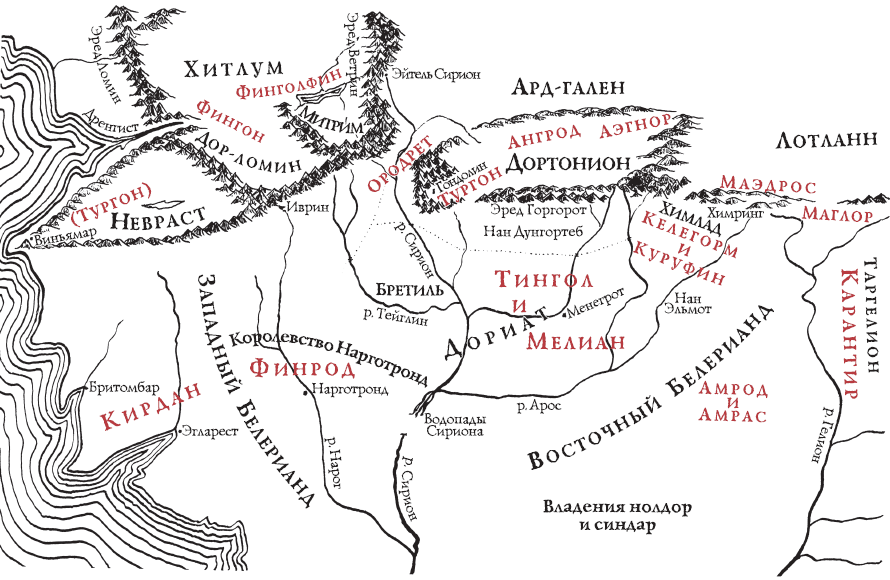 Земли Белерианда, обширные и прекрасные, раскинулись по обе стороны от могучей реки Сирион, воспетой в песнях: река брала начало в Эйтель Сирион, огибала край Ард-галена и ныряла в ущелье, и разливалась все шире, питаемая ручьями с гор. Далее на протяжении ста тридцати лиг текла она на юг, вбирая по дороге воды многих притоков, и, наконец, могучим потоком достигала своих многочисленных устьев и песчаной дельты залива Балар. По течению Сириона с севера на юг, по правую сторону, в Западном Белерианде, от Сириона до Тейглина простирался лес Бретиль, а дальше, между Тейглином и Нарогом – королевство Нарготронд. Истоком реки Нарог стали водопады Иврина на южном склоне Дор-ломина: Нарог катил свои воды на протяжении примерно восьмидесяти лиг прежде, чем впадал в Сирион в Нан-татрене, Краю Ив. К югу от Нан-татрена раскинулись цветущие луга, где мало кто жил; а еще дальше лежали болота и островки тростника близ устьев Сириона, и пески его дельты, где не селилось ничто живое, кроме морских птиц.