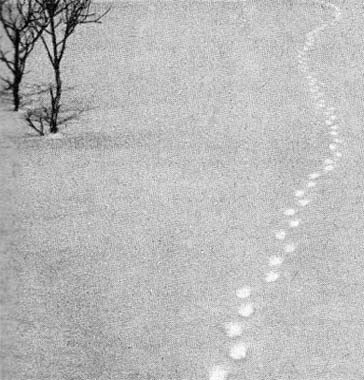 А это следы белки. К весне белки чаще спускаются на снег и бегают сразу по две и по три вместе. Тогда следы их тянутся рядом.
