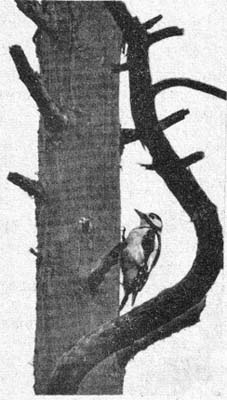 Не может больше считать — вот как наелся! На каждом брёвнышке по муравьев на каждой ступеньке по жуку, на каждой доске — по личинке. Нос набил, язык натёр. И живот из-под перышек вздулся. Синий такой и голый. Ну да, голый: дятел-то совсем молодой!