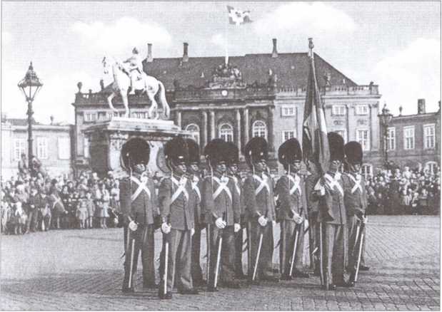Почетный караул королевских гвардейцев перед королевским дворцом на площади Амалиеторг в Копенгагене