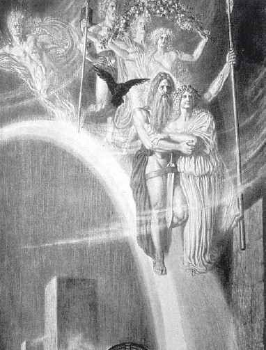 Фридрих фон Штассен. Асы и ваны (1914 г.). Первыми по мосту Биврест спускаются Один и Фригг, за ними — Фрейр, Фрейя, Тор и Локи.