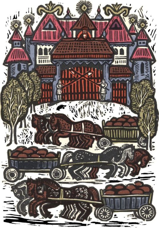 Как ёжик сказал, так и было: хлеб обмолотился и смололся, пироги сами испеклись, на телегу взобрались и, тёплые, душистые, покатили во дворец. Едет сто возов, а впереди ёжик катится, дорогу показывает.