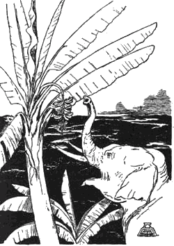 Здесь нарисован слон-дитя в ту минуту, когда он собирается нарвать своим прекрасным новым длинным хоботом бананов с вершины бананового дерева. Я не нахожу эту картинку хорошей, но не мог нарисовать её лучше, потому что рисовать слонов и бананы очень-очень трудно. Позади слонёнка ты видишь черноту, а по ней полосы; я хотел изобразить так топкую болотистую местность где-то в Африке. Большую часть своих лепёшек слон-дитя делал из ила, который доставал именно из этих болот. Мне кажется, картинка станет гораздо красивее, если ты раскрасишь банановое дерево зеленой краской, а слоника — красной.