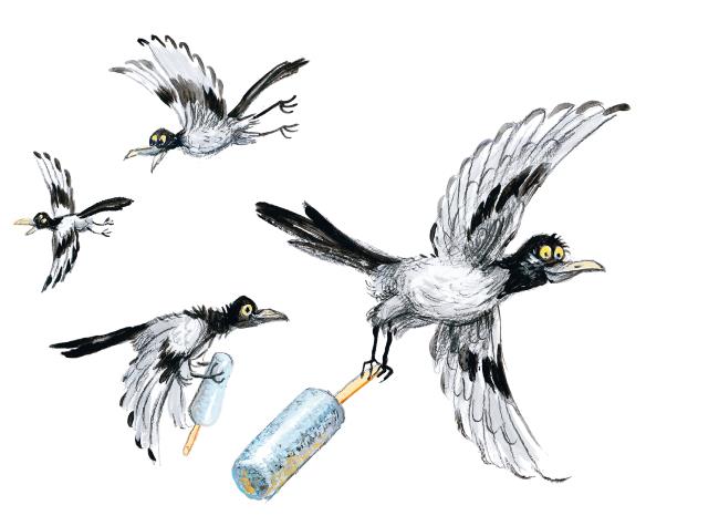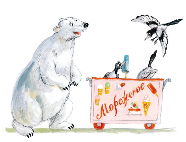 Откуда ни возьмись налетели на продавца сороки-вороны. Расхватали мороженое вмиг. И разлетелись – у каждой в клюве серебряное эскимо на палочке торчит.